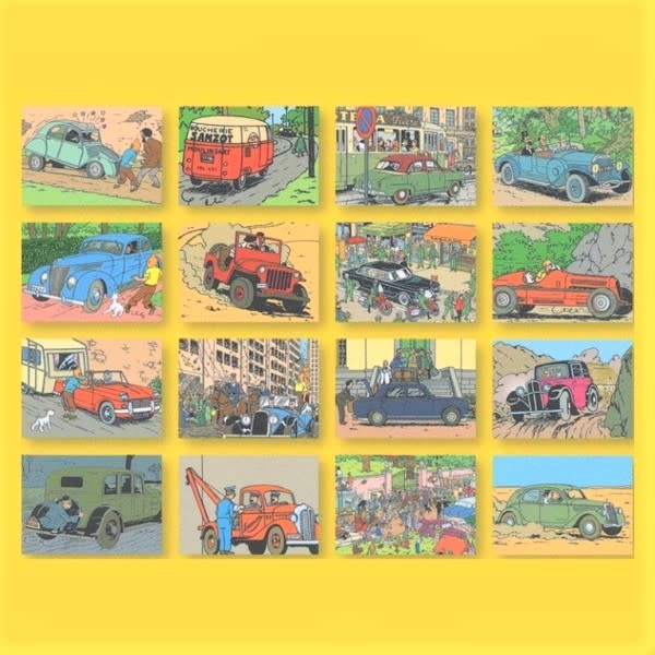 Tim und Struppi Postkarten im Heft - Set à 16 Stück. Mit Bildern aus den berühmten Hergé-Comics: verschiedene Autos, Transporter und Lastwagen. Formatkarten: 15 x 10 cm.