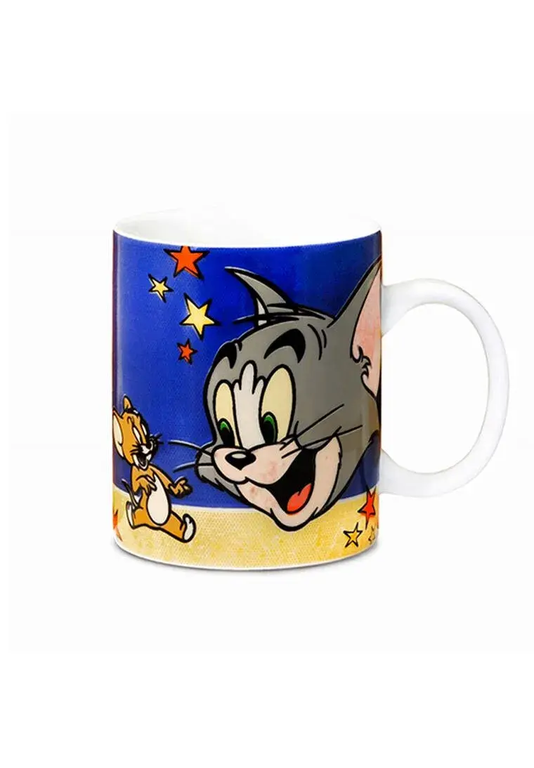 Tom & Jerry Kaffeetasse 325 ml mit Abbildung von diesen ewig populären Comichelden. Die Größe des Bechers ist 10 cm hoch und hat einen Durchmesser von 8 cm. Die Innenseite der Tasse ist weiß, das Material ist Porzellan. Die Tasse ist spülmaschinenfest und geeignet für die Mikrowelle.