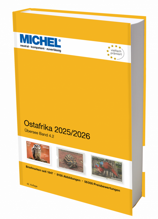 42. Auflage, Katalog der Briefmarken von Ländern und Gebieten in Osatafrika: Britisches Territorium im Indischen Ozean, Burundi, Deutsch-Ostafrika, Kenia (mit Brit.-Ostafrika), Komoren (mit Anjouan, Grande Comore, Mohéli), Madagaskar (mit Diégo Suarez, Nossi-Bé, Sainte-Marie de Madagascar), Mauritius, Mayotte, Ostafrikanische Gemeinschaft (mit Brit.-Ostafrika und Uganda etc.), Réunion, Ruanda, Ruanda-Urundi, Sansibar, Seychellen, Tanganjika, Tansania, Uganda, Bewertungen in Euro, 774 Seiten in Farbe, in deutsch, Erscheinungsjahr 2025