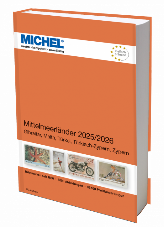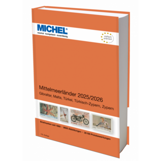 110th edition, case bound! postage stamp catalogue Europe part 9, includes Cyprus, Eastern Rumelia, Gibraltar, Malta, Turkey & Turkish Cyprus; valuations in Euro, 708 pp in colour, in German, published 2025