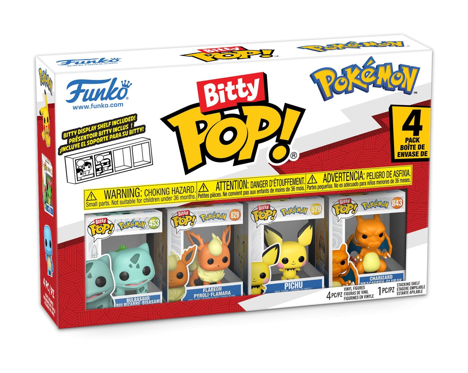 From Funko's "Bitty POP!" series comes this pack of 4 mini vinyl POP! figures. Each figure stands approximately 2 cm tall and comes in its own acrylic packaging featuring the familiar Funko POP! design. A stackable display case that can hold all four figures is included. Collect all these adorable Pokémon Funko POP! mini figures!