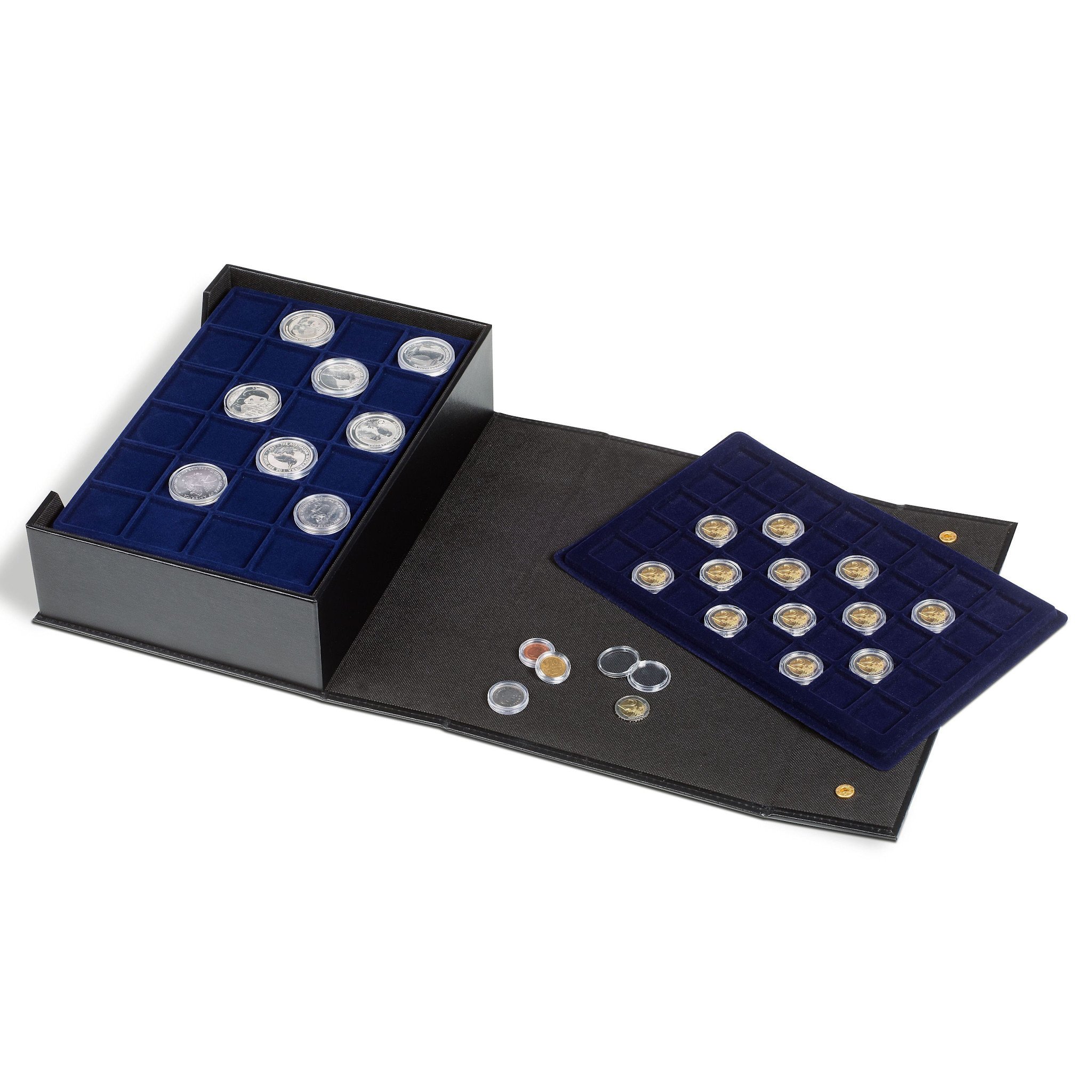 Please note: The presentation case fits 7 each of the slightly higher coin trays TAB for Slabs (Ref. No. 300 028) and of the encapsulated champagne caps (Ref. 329 370).