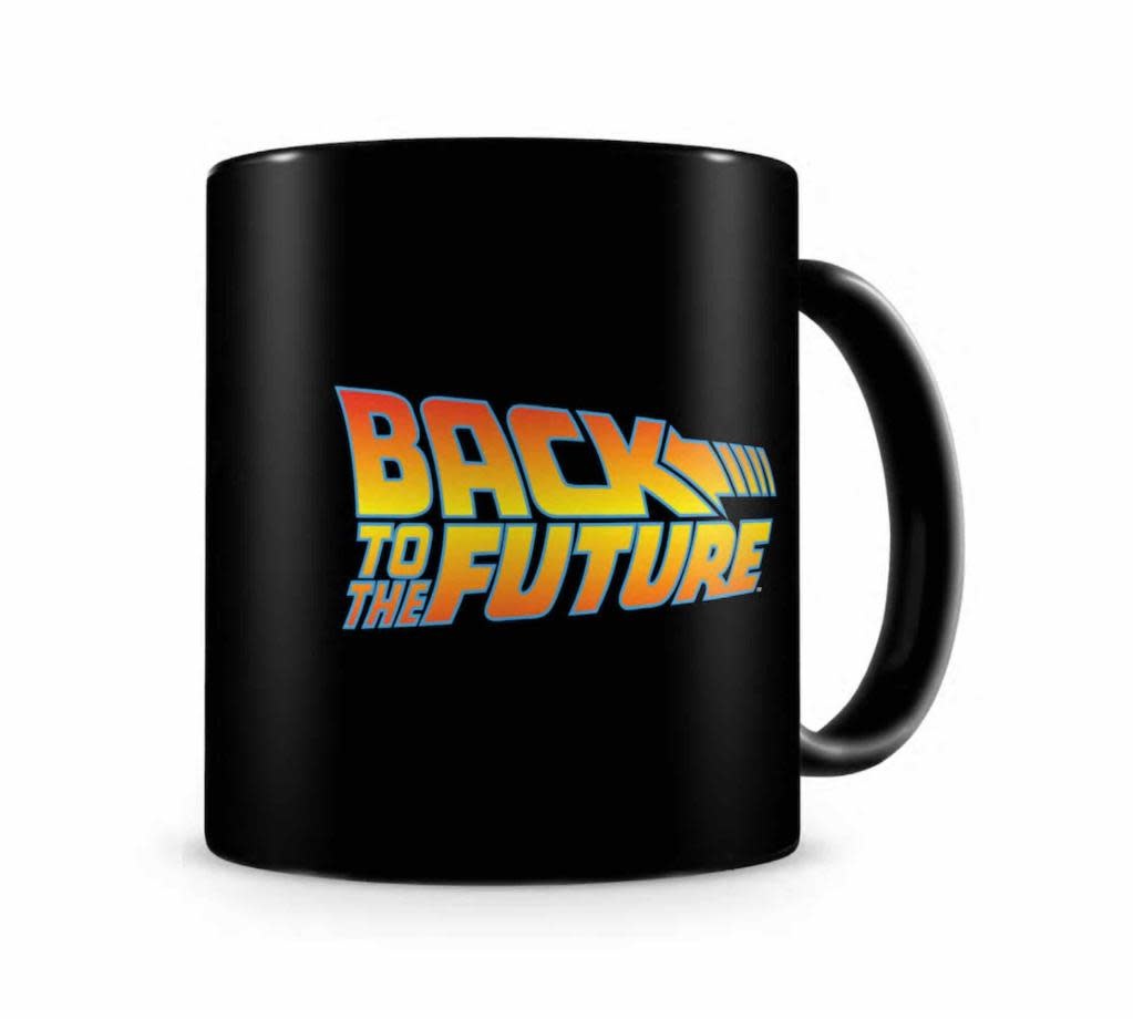 Black ceramic mug with logo of the cult movie Back to the Future.