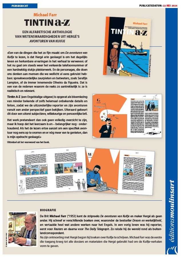 Tintin A-Z (an English language edition) is meant to be an anthology of less known or even completely unknown details and facts, so that we may see the extraordinary reporter from a different perspective. Ofcourse, this is done through an extremely subjective, random and personal view.