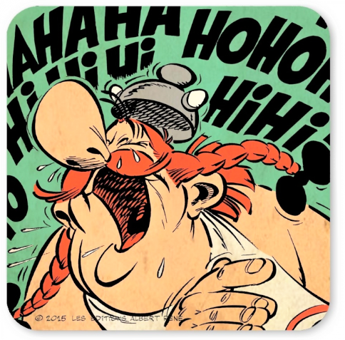 Grappige Asterix en Obelix coaster: Lachende Obelix. Naar de bekende stripboeken van Goscinny en Uderzo. Formaat: 10 x 10 cm. Het plaatje aan de voorkant is van melamine, daartussen geperst hout en achterop bedekt met kurk. Stel je eigen setje samen van meer van deze grappige coasters! Leuk als kadootje.