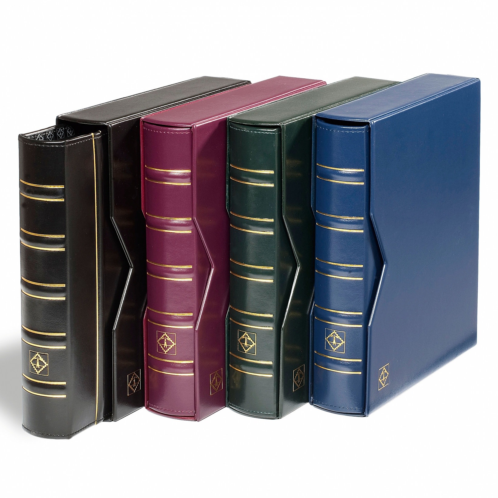 Boekbinderskwaliteit bij de afwerking, band van kunst leer, ruimte voor maar liefst 60 OPTIMA-bladen (afhankelijk van de dikte van de inhoud), stevig. Kleuren: rood, groen, blauw en zwart. Buiten formaat: 245 x 270 x 55 mm.