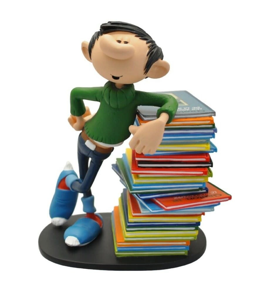 Dit beeldje toont Guust Flater (oorspronkelijk Gaston Lagaffe), een personage uit de Belgische stripreeks van André Franquin. Hij draagt zijn typische groene trui, blauwe jeans en grote schoenen, terwijl hij tegen een stapel stripboeken leunt, wat zijn onhandige maar sympathieke karakter weerspiegelt.